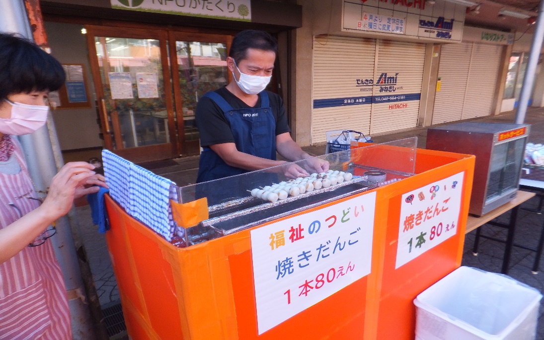 「福祉のつどい」に出店しました 2021年10月3日 Filed under: 日々のできごと かたくり 「福祉のつどい」に出店しました 10月3日(日)今年度の福祉まつりはコロナ過を考慮して、参加希望の事業所前での販売となりました。 かたくりは村山団地中央商店街の真ん中で、販売です。今日は秋晴れの気持ちの良い一日でした。午前10時からの販売開始のため準備を急ぎます。販売するのは、布ぞうり・ミニストラップ・ふきんに焼き団子です。他の福祉施設のパンフレットも紹介の為配布します。本日「焼きだんご」デビューの木住野職員は、かなり緊張気味です。教えるのはサービス管理責任者の山本職員です。木住野職員は「才能アリ」で合格点だそうです。そんなことをしていると、お客さんがぞろぞろと。布ぞうりをお買い上げいただきました。わりと忙しい日となりました。山澤職員も駆けつけてくれて、「団子まいどあり」穏やかな「福祉のつどい」となりました。